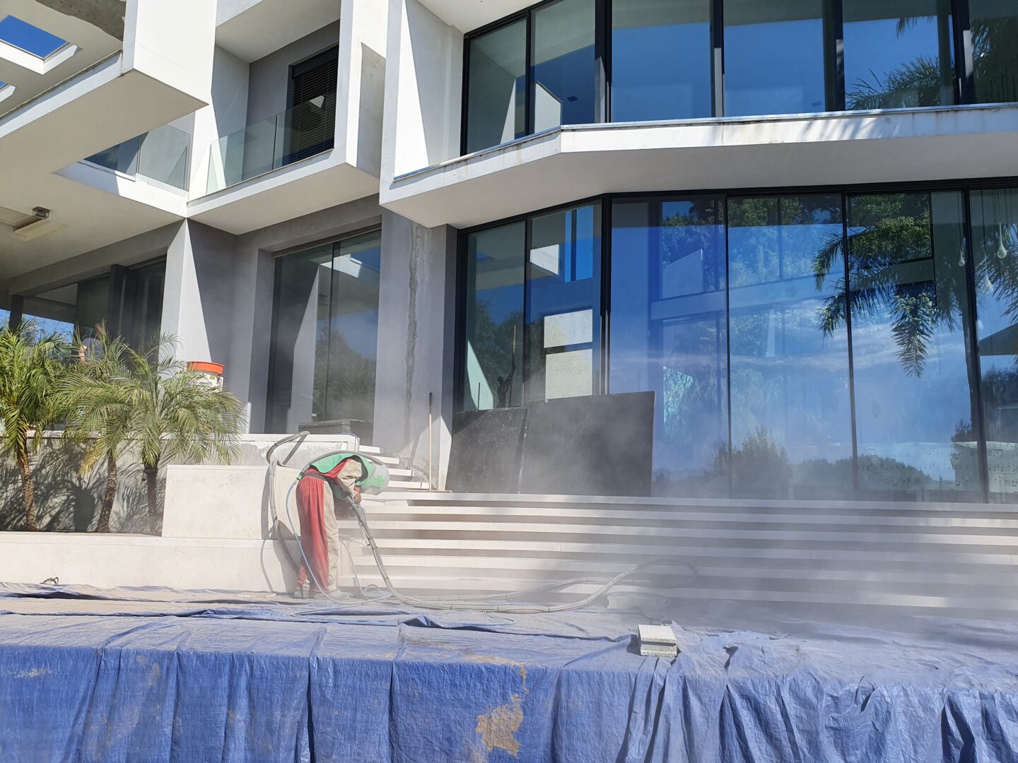 L’eau (hydrogommage) qui sera pulvérisée pour diminuer poussières et projections. Son action adoucit aussi l’effet abrasif du granulat.